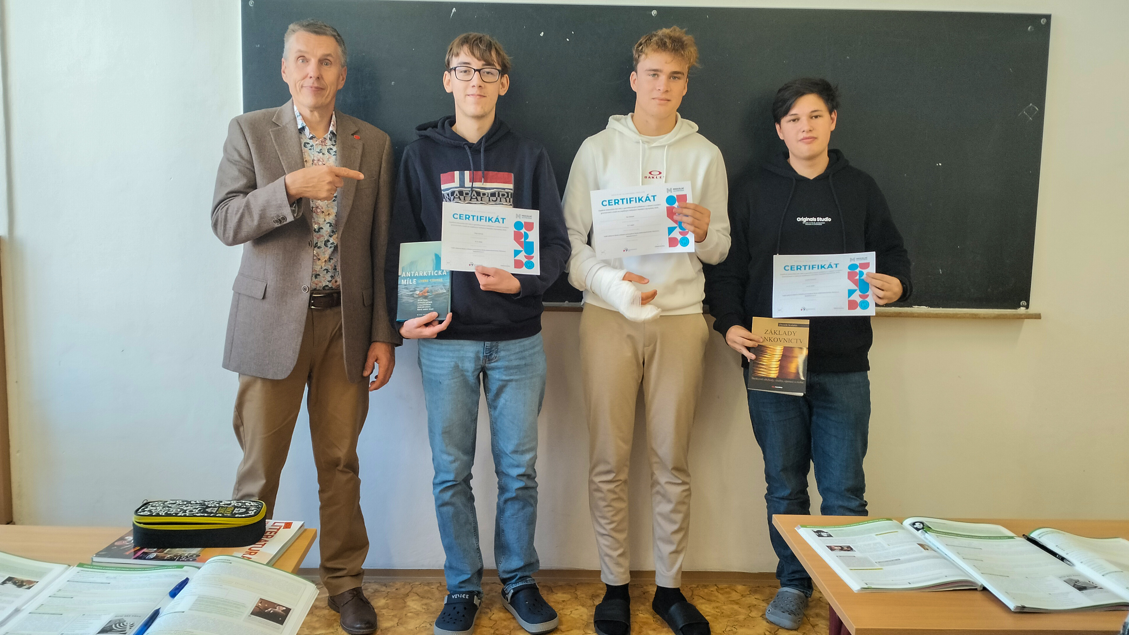 Tým tří studentů třídy 4L, ve složení Daniel Deutsch, Jan Skopal a Filip Výmola, se zúčastnil mediální olympiády 2025. Chlapci během týdne plnili úkoly zaměřené na rozpoznání dezinformací, orientovali se ve světě médií a informací.