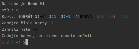 Každý tah zahájí funkce play(). Z ní se spustí choose_card(), ve které si uživatel (jak již název napovídá) vybere z ruky kartu. Funkce si vytvoří vlastní slovník hratelných karet a podle toho také vygeneruje UI. Každá karta má ve slovníku přiřazené pořadové číslo a pokud ho uživatel napíše, kartu zahraje. Pokud chce jen dobrat z balíčku, může stisknout 0. Pak jsou tu i nějaké další podmínky, například na stopku nebo dobírání plus karet. Nakonec funkce vrátí vybranou kartu.
