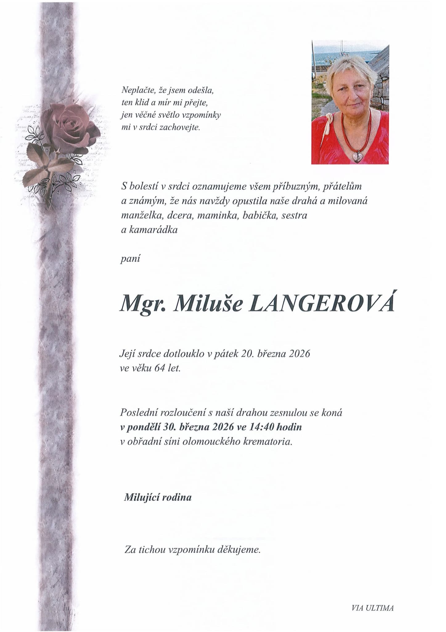 S hlubokým zármutkem oznamujeme, že nás opustila naše dlouholetá kolegyně, paní Mgr. Miluše Langerová. Na škole působila celých dlouhých 31 let od roku 1993. Po celou tuto dobu zasvěcovala stovky žáků naší průmyslovky do tajů jazyků, jak toho mateřského tak německého. Zapojovala se do školních projektů a přispívala k přátelské atmosféře celého kolektivu.