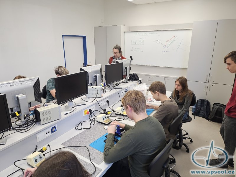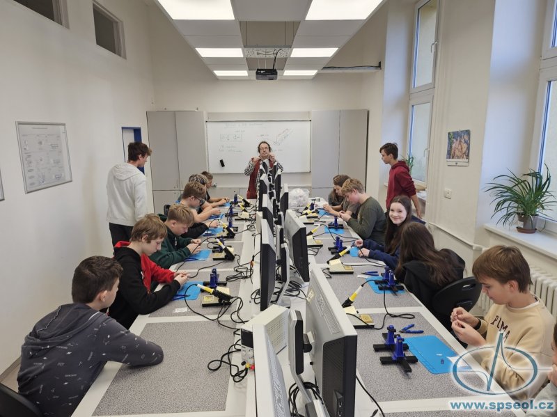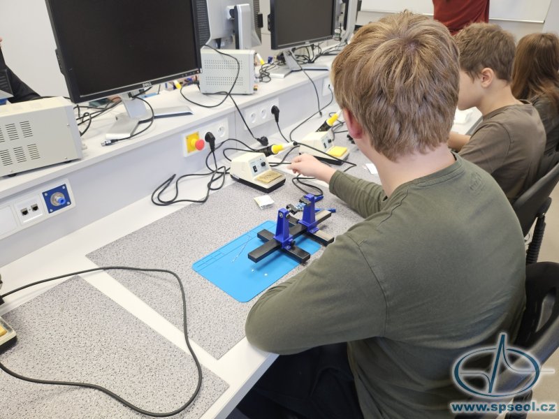 Na posledním stanovišti si vyzkoušeli práci s páječkou a základní techniku pájení. Pro většinu žáků to byla zcela nová zkušenost, kterou zvládli velmi dobře a s viditelným zájmem.